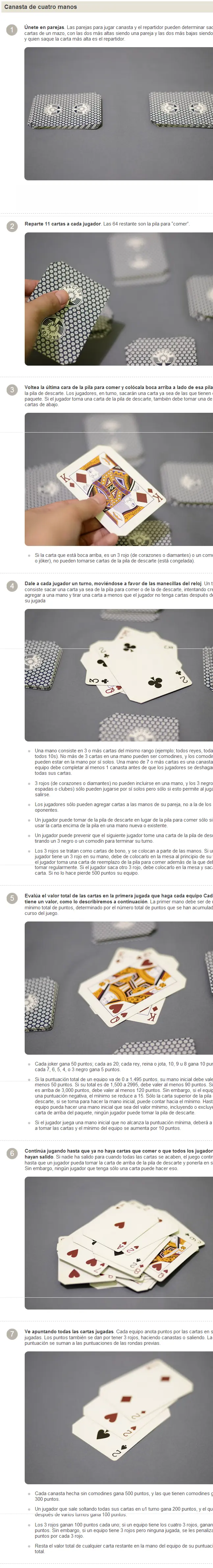 Canasta es un juego de cartas para 2, 3 o 4 jugadores. Se desarrollo en Uruguay en 1939, se esparció por toda Sudamérica y llegó a los Estados Unidos en 1946. Aquí te damos las reglas para jugar la forma original de Canasta.