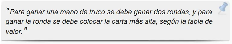Para ganar una mano de truco se debe ganar dos rondas, y para ganar la ronda se debe colocar la carta más alta, según la tabla de valor que veremos más adelante.