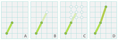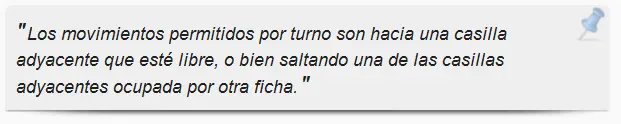 Los movimientos permitidos por turno son hacia una casilla adyacente que esté libre, o bien saltando una de las casillas adyacentes ocupada por otra ficha, ya sea propia o de un contrario. En el caso de que se salte y la ficha lleve rumbo de una casilla continua a otra que está ocupada, puede seguir moviendo la pieza con la que se empezó, lo que significa que en un sólo movimiento una ficha puede avanzar de una punta del tablero a otra.