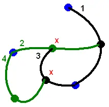 En azul los puntos iniciales, marcados con X los puntos saturados.