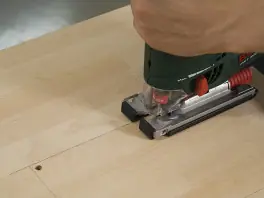 Con la sierra de calar apagada, sitúe la hoja en uno de los agujeros. Corte por dentro del lado interior de las líneas trazadas y vaya de agujero a agujero. En caso de que no quiera que las esquinas queden redondeadas, repase los ángulos con la sierra de calar.