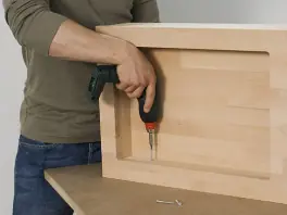 Las partes delantera y trasera del cajón quedan entre los laterales (un poco más largos); atorníllelos con el atornillador ACCU y tornillos de 3 x 25 mm de modo que formen un marco como se describe en el punto dos.