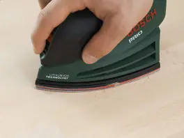 Rebaje en primer lugar todos los bordes; aplique para ello hoja de lija de granulado 120 o 180 en un ángulo de 45°, de forma que cree un pequeño bisel. Lije las superficies con la lijadora siempre en la dirección de las vetas de la madera, en primer lugar con una hoja basta (120, 180), y después con una fina (hasta 240).