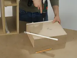 Atornille el lateral corto del cajón al tablero; coloque los tornillos 10 mm alejados de los bordes de los laterales estrechos y 2,6 mm de los bordes de los laterales largos. De esta forma, los orificios quedarán ocultos una vez finalizado el montaje.