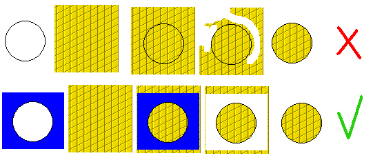 Imaginaros que dentro de un cuadrado, circulo o selección de una imagen queréis poner una textura hecha con paint etc... y que pasa si hacemos lo que ocurre en el 1 caso?, pues que nos tocara quitar píxel a píxel hasta recortar toda la textura que sobra del circulo lo que nos llevara un ratito y mas si el circulo fuera de dimensiones mayores. Una forma mas fácil seria ponerle al circulo un cuadrado azul como veis y ponerlo encima de la textura y luego borramos el color azul y en un segundo tenemos el circulo listo.