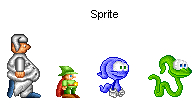 Sprite : Los sprites son las imágenes de los personajes, bichos, etc. Por ejemplo los personajes del Streets of fighter son Sprites, el muñeco que manejas en los rpg es un sprite, se podría decir que todo lo que puedas manejar/controlar es un sprite (un coche en el gta1, un personaje del final fight....). Como ejemplo esto serian los frames del sprite de un juego.