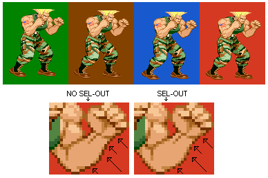 Sel-Out : Técnica aplicada mayoritariamente en sprites de lucha tipo Strets Fighters, pero que puede ser aplicada a cualquier imagen y que como veis en el ejemplo, este donde este el dibujo parece como si estuviera hecho para ese color fondo pero no es así.