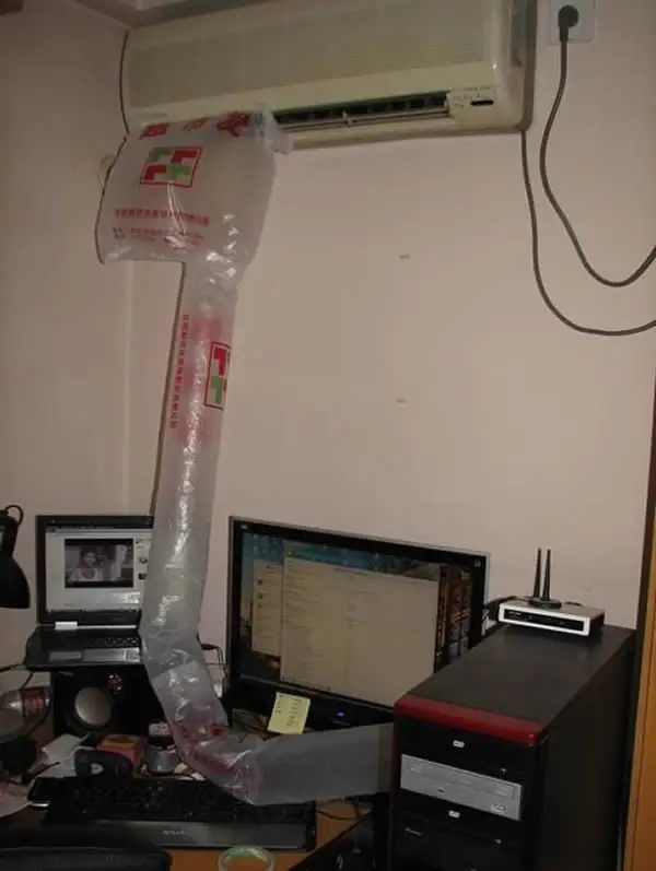 Corta las bolsas plásticas, de modo de ir formando un tubo de plastico con el tape, segun la distancia de tu minisplit con el CPU.