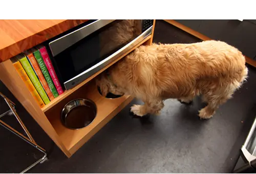 ¿Tienes un estante de la cocina vacía? Sentirse útil? Cortar agujeros en una parte inferior de la plataforma y los cuencos de comida para perros avellanado para un lindo y fuera de la vía la estación de alimentación del perro.