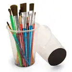 Un molde para muffins se convierte en un carrito de artesanía y los imanes mantienen los vasos de plástico pegados al fondo.