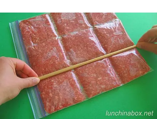 Coloque la carne picada en una bolsa ziploc grande y aplastar de manera uniforme. Separe a las partes con un palillo o una brocheta y luego congelar. Cuando llega el tiempo de descongelación, sólo tiene que romperse la cantidad que necesita y poner el resto en el congelador.