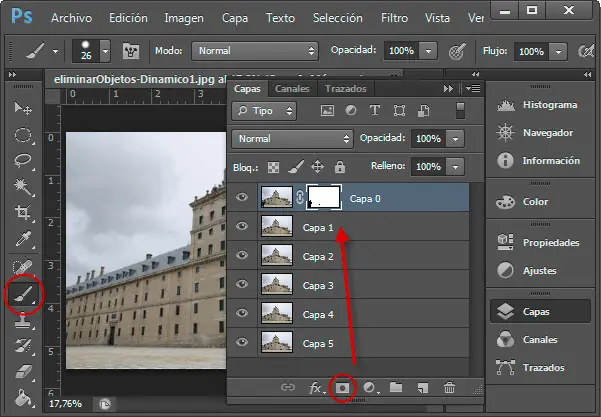 3. Lo siguiente será crear una máscara de capa sobre la primera capa e ir ocultando (pintando con negro) aquellas porciones de la imagen en que estén los objetos en movimiento.