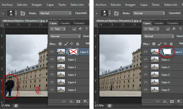 En la imagen superior puedes ver cómo al aplicar la máscara de capa conseguimos eliminar la información de los elementos en movimiento, siendo sustituido su contenido por el de la imagen inferior.