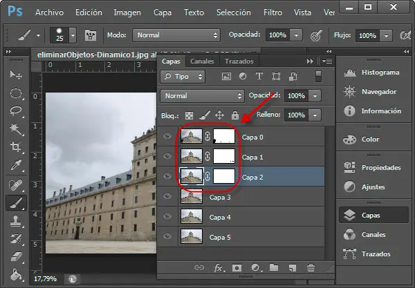 Ten en cuenta que las capas se ocultan unas a otras y cada capa sólo permitirá visualizar el contenido de la capa inmediatamente inferior en aquellas zonas en las que en su máscara de capa se haya pintado de negro.