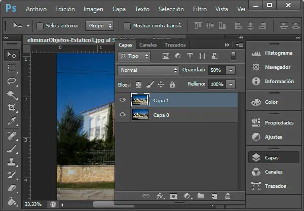 3. Reduciendo la opacidad de la capa superior a 50% podremos ver cómo el cable está situado en ambas capas en distinta posición. Esto es lo que utilizaremos para poder eliminarlo.