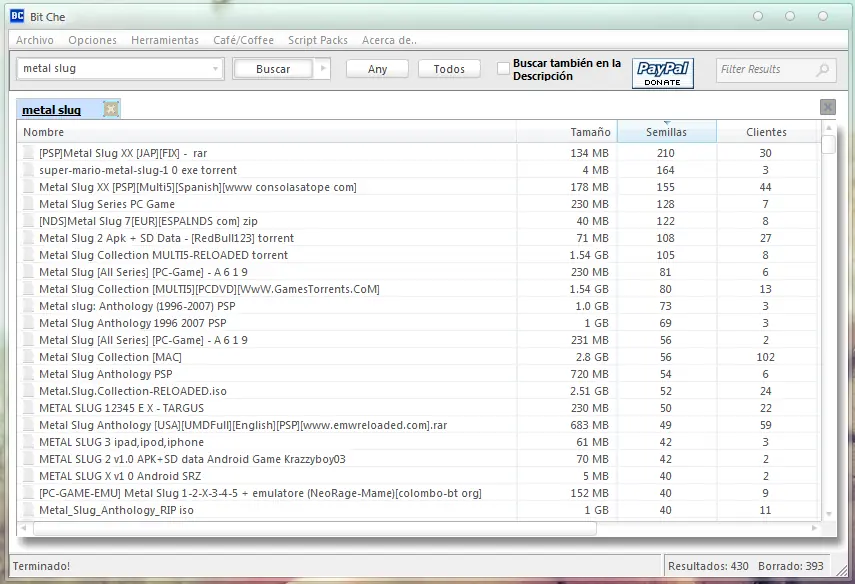 Con Bit Che podrás repetir la búsqueda de una palabra cada cierto tiempo, ocultar los resultados que no tengan seeds suficientes, y ver información sobre el contenido que vas a descargar. Además, Bit Che te facilitará el fichero .torrent correspondiente.