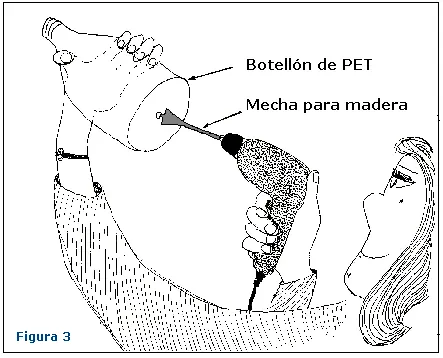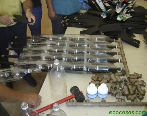 Se utiliza el tubo de PVC de 100 mm como molde y se cortar la parte inferior de las botellas. Se corta la tubería de PVC de 20 mm en 10 x 20 x 1m y 8,5 cm de piezas y se ensamblan con el conectores T. Se cortan y pintan los cartones en tono negro mate, así como las tuberías de un metro de largo. Y se ensamblan.