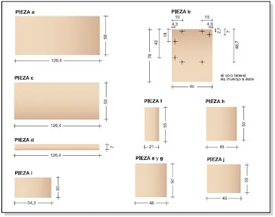 Es necesario realizar el agujereado previo según la figura del detalle de las piezas, con pasadas de 2,5 a 3 mm de diámetro en función al tornillo que se utilizará. Esto facilitará el correcto armado del mueble.