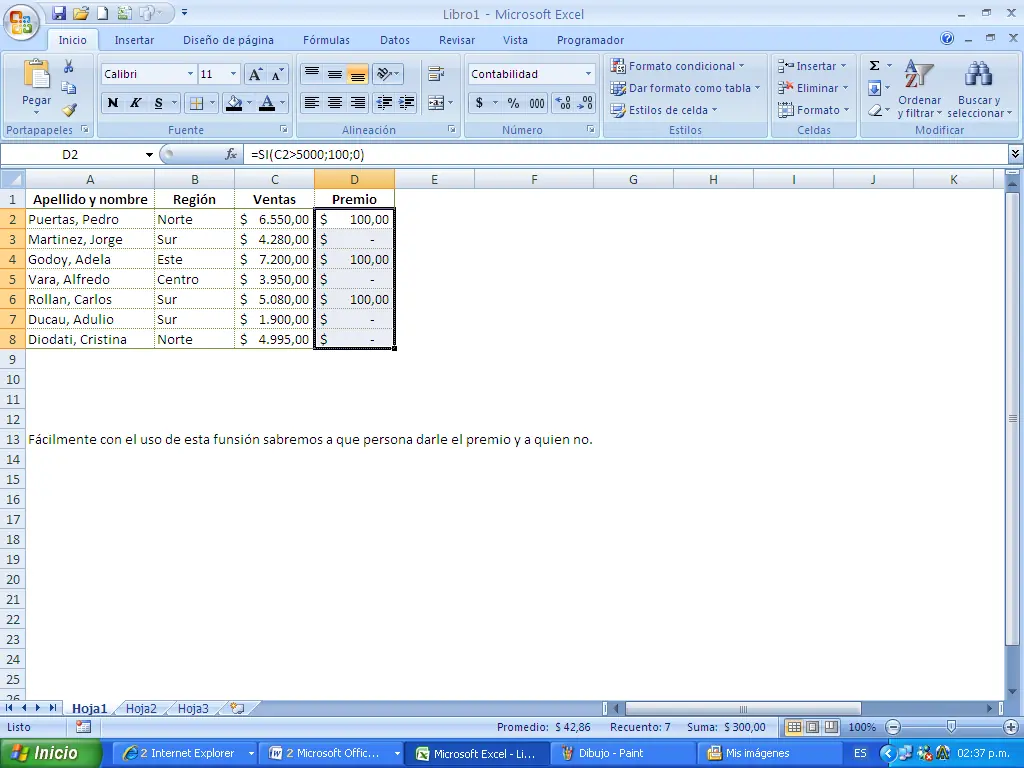 Considerando los importes de las ventas en la columna C, a partir de la segunda fila el premio se obtiene escribiendo en D2 la función condicional =SI(C2>5000;100;0).