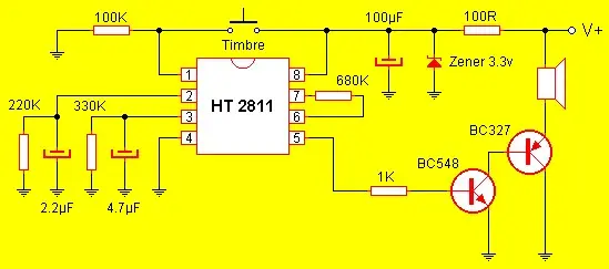 El circuito recibe alimentación a través del punto marcado V+ y masa. El corazón del mismo es el integrado HT2811, desarrollado por la firma koreana Holtek. Por el pin 1 ingresa el pulso de disparo, indicándole al chip que produzca el sonido "Ding-Dong". Los pines 2 y 3 se conectan a conjuntos RC que establecen cada uno de los sonidos (2 = "Ding" / 3 = "Dong". Alterando estos componentes se logra variar el sonido de las campanillas. El pin 4 corresponde a la masa. Por el pin 5 sale la señal de audio que es amplificada por un par de transistores de uso general en configuración darlington. Los terminales 6 y 7 se conectan a una resistencia de 680K que ajusta la ganancia del pre-amplificador interno del chip. Por último por el terminal 8 ingresa la alimentación al chip la cual es limitada en corriente por la resistencia de 100 ohms y estabilizada a 3.3v por medio del diodo zener. El capacitor de 100µF filtra el posible rizado que quede en la línea de alimentación.