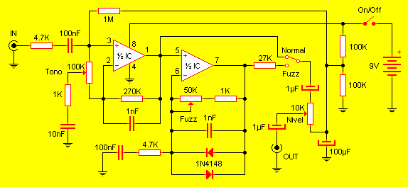 La señal ingresa desde la guitarra o bajo por medio del conector marcado como IN. Pasando a través del capacitor y la resistencia ingresa a la primera sección del circuito integrado LM358 el cual actúa como previo. El conjunto RC conectado entre la salida (pin 1) y la entrada inversora (pin 2) actúa como realimentador, desde donde se toma una muestra de la señal para efectuar el control de la tonalidad. A la salida la señal ingresa a la segunda mitad del integrado, donde hay otro operacional. Además va a la llave selectora que permite utilizar o anular el efecto fuzz. En este caso el circuito de realimentación incluye un par de diodos en paralelo opuesto que se encargan de recortar la señal. La magnitud de la señal recortada depende del cursor del potenciómetro de 50K, el cual actúa como regulador de efecto. La salida de este amplificador (pin 7) se aplica a la otra terminal de la llave selectora de efecto, cuyo punto medio se inyecta al potenciómetro que establece el nivel de la señal de salida que finalmente saldrá hacia la etapa de potencia.
