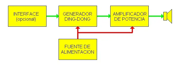 Cada vez que se pulsa el timbre el generador de Ding-Dong crea una débil señal de audio con el sonido de las campanillas. La señal es elevada en su volumen por el amplificador y es reproducida por el parlante. La fuente de alimentación provee al circuito de la tensión necesaria para operar. La interface permite conectar el circuito a timbres alimentados centralmente como el de edificios o portero eléctrico.