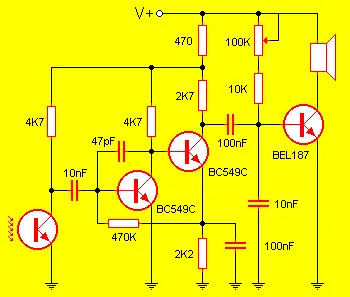 Como observará no hay nada especial en este circuito, el desacople de continua a la entrada, por medio del capacitor electrolítico no polarizado, la realimentación, la carga RC y, por supuesto, el parlante.