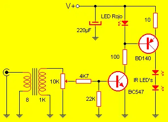 Como se ve en el circuito el transmisor es extremadamente simple. El transformador está dispuesto como adaptador de impedancias, siendo su bobinado de baja impedancia conectado en paralelo con el parlante del TV o radio. Los diodos infrarrojos usados son comunes. El resistor de 10 ohms que limita la corriente a través de los diodos IR debe ser de 1w. Este transmisor de alimenta de 9vcc que pueden ser provistos tanto por una batería común como por un adaptador AC/DC