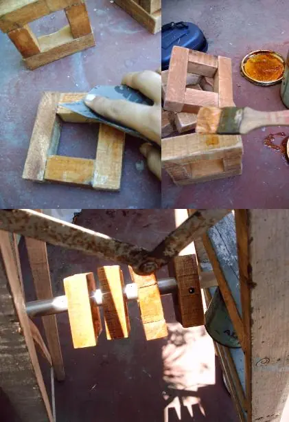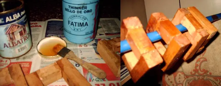 ahora viene el barnís! lijé un poco cada pieza y mandé 1 capa de barnís las dejé secando puestas en un palo de escoba. (el thinner lo usan en el barnisado para limpiar pinceles y limpiar cualquier mancha de barnís)