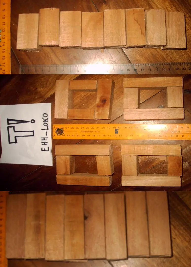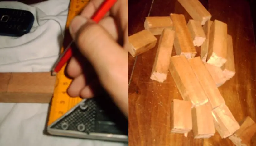 a las 16 maderas (8 de 5 cm y 8 de 10 cm) las emparejé con la escofina y las ordene para ver como las pegaba