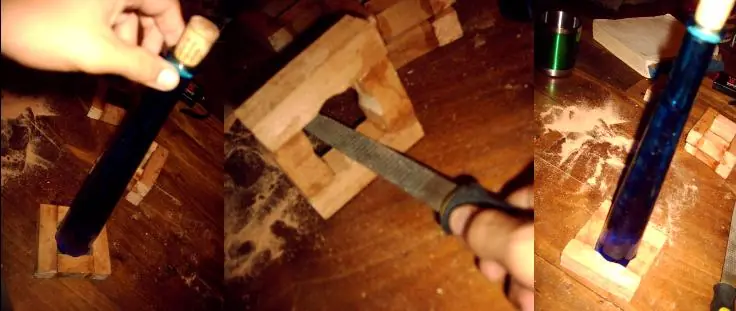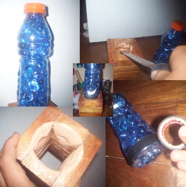 como la base de la botella era mas ancha tuve que darle con la escofina hasta que entre bien , que quede derechita y equilibrada...cubrí con un poco de cinta aislante la base de la botella para que ajuste más