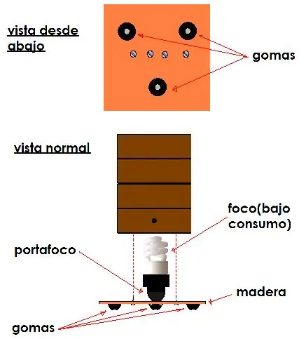 ahora viene la base, la que hace pié a toda la "estructura" con la madera fibrofácil de 15cm x15,5cm x6mm . No saqué fotos del procedimiento pero armé uno con el paint. Las gomitas que menciona son unos topes para puertas que me vinieron re piola y los puse abajo como patitas. Atornillé el portafoco e hice los agujeros para los tornillos que sujetan la "base para la botella"