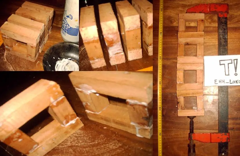 y las pegué(use cola marca chorizo, no tenía vinílica de carpintero)las puse en la prensa asi quedaban bien apretaítas, el objetivo es que queden 4 cuadrados iguales y ponerlos uno arriba del otro formando una especie de torre con el agujero en el medio.