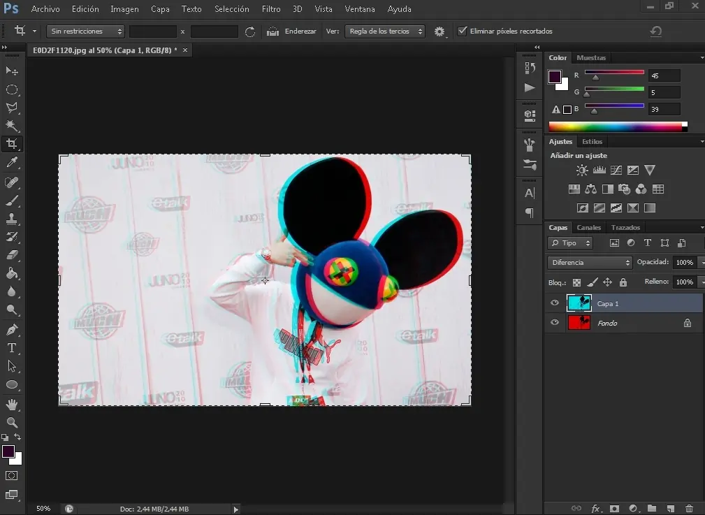 Seleccionamos la capa que nos quedo en azul y le damos a la opcion de "Diferencia"
