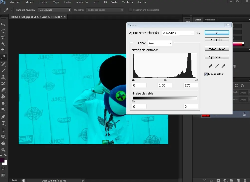 sin cerrar la ventana de NIVELES seleccionamos el canal AZUL y le ponemos el siguiente valor