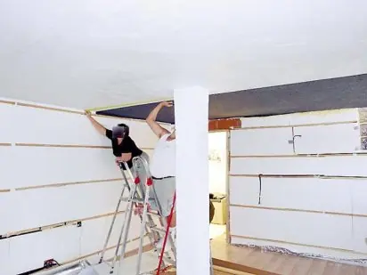 Empezamos con el trabajo en el techo. Para pegar la moqueta se empieza dando una imprimación, que se deja secar un día entero. La moqueta la compraron ya cortada en tres bandas, y el ancho que pusieron era el máximo que daba el rollo.