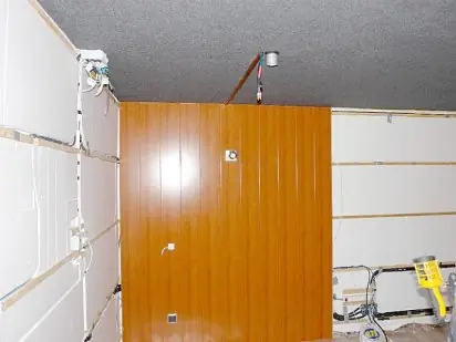 Aquí ya habían pasado la luz a la pared de la entrada, habían puesto el punto de luz y el interruptor, y faltaba colocar los rastreles encima de la puerta y el aislante a la izquierda de la puerta. Tras algunas vacilaciones, quitaron el punto de luz del techo.