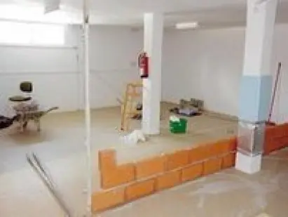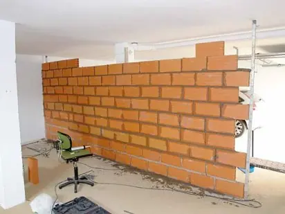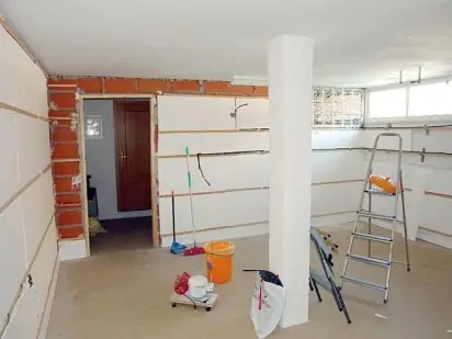 El primer paso fue levantar el tabique para dividir el garaje en dos. Al fondo quedaría la sala de cine, y a este lado, el garaje para los dos coches. Para el tabique escogieron un ladrillo de formato grande, que permite trabajar con rapidez.