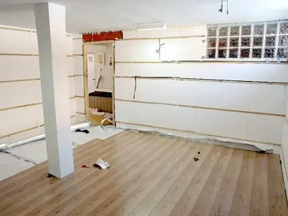 Cuando estaban montados los rastreles con los cables metidos, pusieron el suelo de tarima. "Teníamos que haber puesto primero el techo", dice Perchita, "como iba con moqueta pegada, algo de pegamento cayó al suelo y luego nos tocó fregar a conciencia".