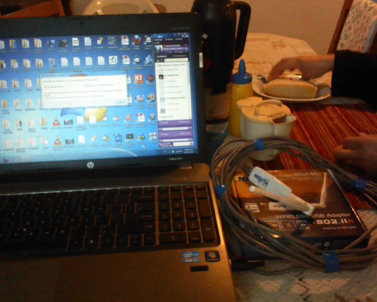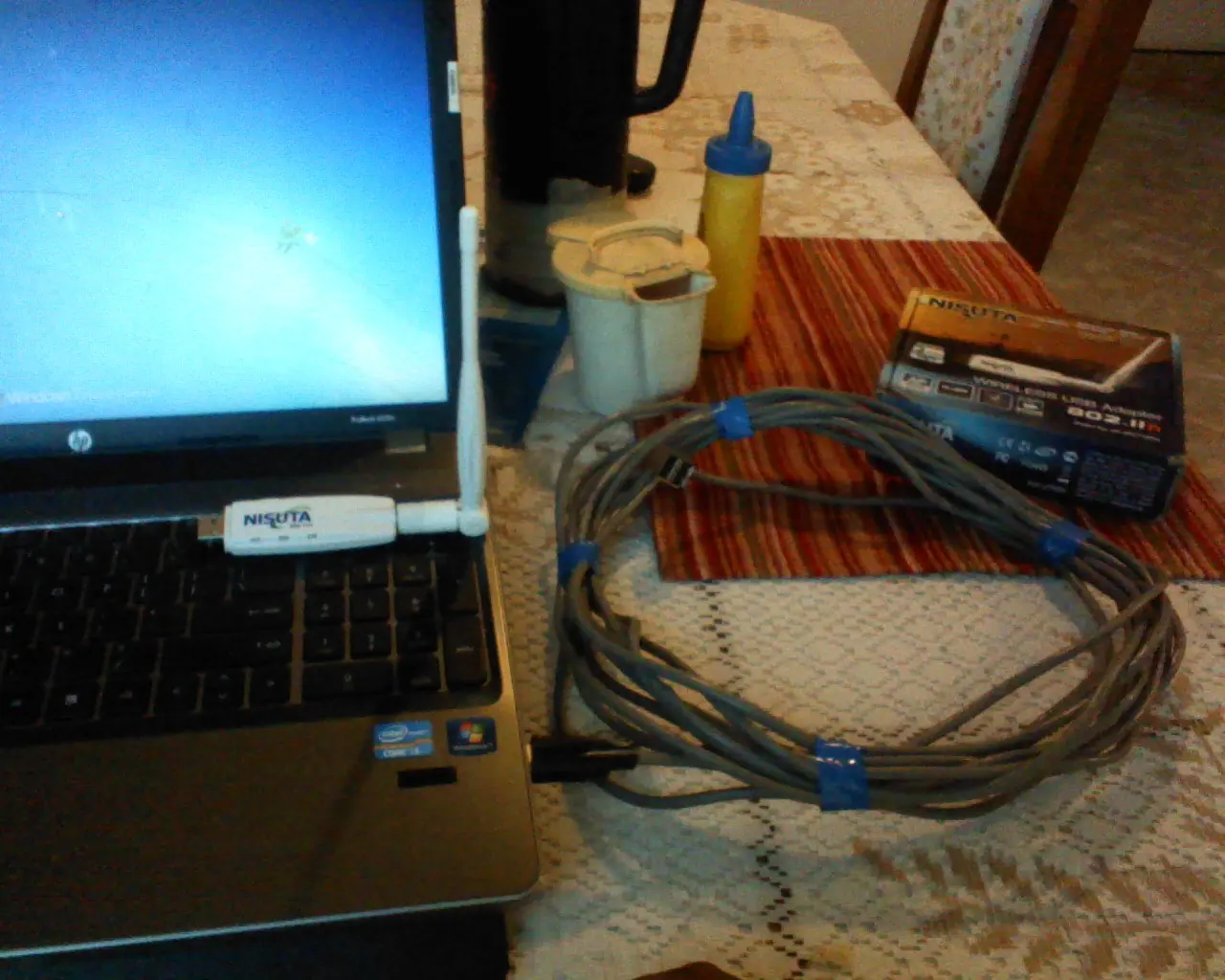 Aqui el Wireless Nisuta NS-WIU150NS, con un cable de extensión normal no era reconocido por la computadora, es de un vecino que no se puede conecta a su red por estar demasiado lejos la PC desde el Router.