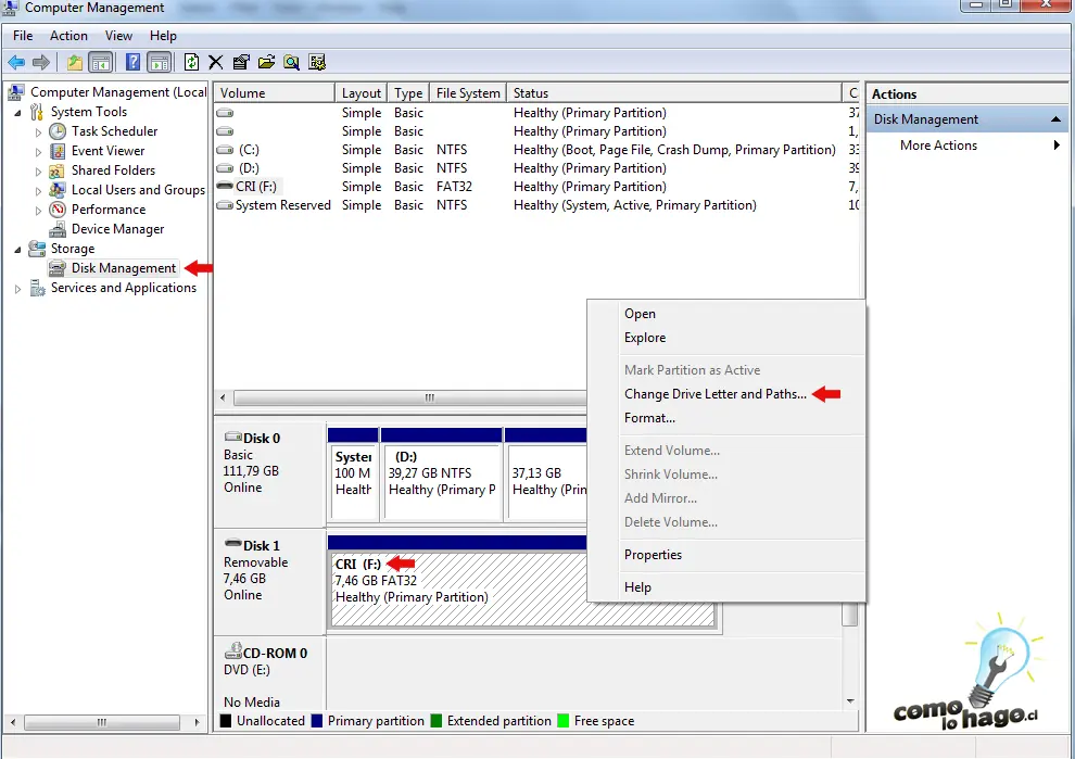2. Ahora lo que debemos hacer es dirigirnos dentro de la nueva ventana que nos ha aparecido hacia el menú Administrador de discos (o Disk Management) > Seleccionar nuestro dispositivo USB click derecho y luego seleccionamos la opción Cambiar letra y caminos de unidad (o Change drive Letter and Paths).
