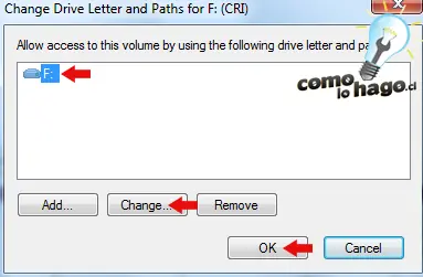 3. Luego les aparecerá la siguiente ventana que muestra la letra que tiene asignada nuestra unidad USB. Para realizar el siguiente cambio y avanzar debemos pulsar el botón Cambiar (o Change) y luego clickeamos OK.