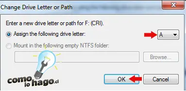 4. Ahora lo que haremos será asignarle una nueva letra a nuestra unidad USB. Debemos dirigirnos donde aparece letra que apunta la Flecha Roja y dejarla en la letra A (Como nuestra unidad en un principio tenia asociada la letra F, con este paso le asigamos la letra A). Pulsamos el botón Ok las veces que sea necesario y listo.