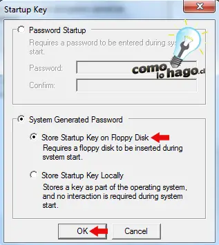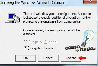 5. Para añadir dentro de nuestra unidad USB la configuracion para que se vuelva esencial al momento de ingresar a Windows debemos dirigirnos a Inicio > Ejecutar y escribir Syskey. Nos aparecerá un menú como el de la siguiente foto y solo debemos pulsar el botón Update.