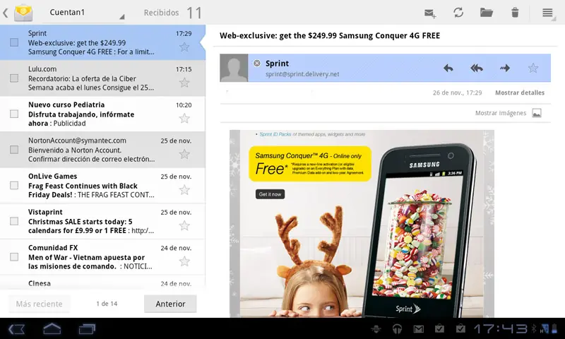 Correo electrónico. ¿Qué mejor que revisar tu correo en un Tablet? Ni en un PC. Como muestran las capturas siguientes, tenemos un formato horizontal con pantalla partida: lista de correos, y visualización de contenido a la derecha; o un formato vertical para ver solo el contenido del correo. Siempre podemos combinar ambos.
