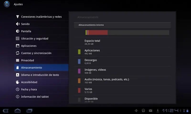 -. En almacenamiento, tendremos una útil visual de lo que ocupa el contenido almacenado en el Optimus Pad (con 32GB de almacenamiento disponible).