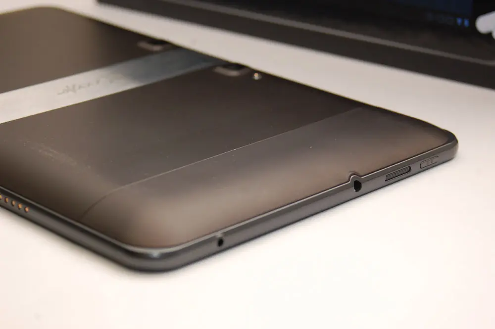 El Optimus Pad tiene unos buenos acabados generales en los que destaca la zona trasera completamente recubierta de goma, con la excepción de una franja central metálica, que incluye el logotipo de Google, y sirve a modo de clara identificación del producto frente a la competencia. Los bordes del cuerpo del dispositivo están bien redondeados, y en la zona trasera observaremos como la superficie, en los 4 lados, tiende a curvarse, lo cual contribuye a un agarre más natural del dispositivo.