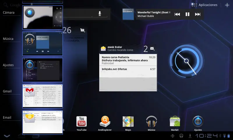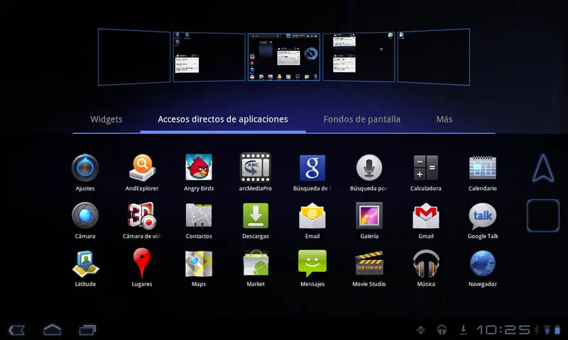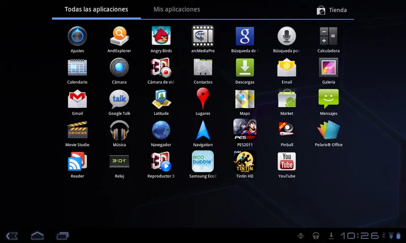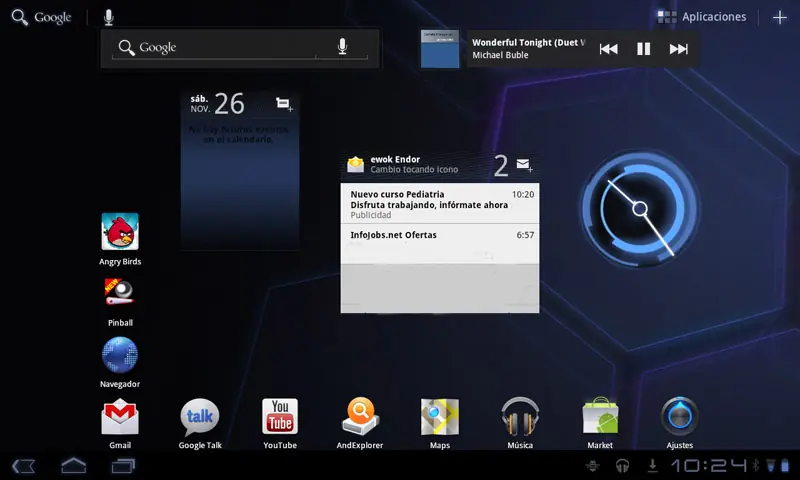 En la esquina superior izquierda hallaremos el buscador de Google, para que rápidamente podamos encontrar algo que nos interesa en Internet. Y finalmente, desde la esquina superior derecha, entramos al menú de aplicaciones, ordenadas alfabéticamente y diferenciándose dos pestañas, una que agrupa todas las apps de las que disponemos, y otra con solo las apps descargadas de Android Market. Existen 35 apps por espacio o escritorio, que en esta versión de Honeycomb 3.1 no permite la creación de carpetas y tampoco una libre distribución de los elementos.