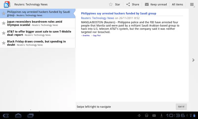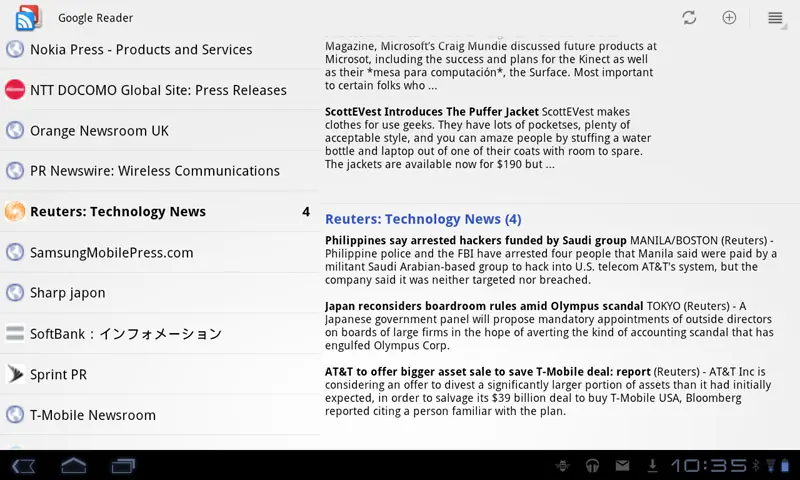 -. Google Reader: si algo adoro de los tablets, y que para mi es básico, es la ventaja y la facilidad que supone revisar noticias de fuentes RSS. Periódicos, blogs de noticias y multitud de webs de marcas hacen uso de un sistema eficaz y práctico para sincronizar nuevas noticias publicadas. Además, con una cuenta Google podemos gestionar las fuentes desde el PC y luego revisar las noticias desde la app compatible con Tablet y Smartphone.