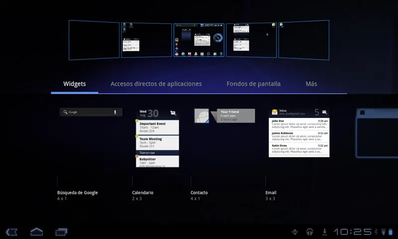 Como observación inicial debo decir que Android Honeycomb, desafortunadamente, no aprovecha nada bien el tamaño de pantalla en lo que se refiere a widgets: pudiéndose dotar widgets de Facebook, Twitter, o correo electrónico con una previsualización de al menos 7 u ocho líneas, Honeycomb 3.1 nos ofrece pequeñas ventanas que saben a poco. Sí es cierto que podemos agregar más elementos en un solo “escritorio”, pero la utilidad aquí debería residir en la fuerza visual.